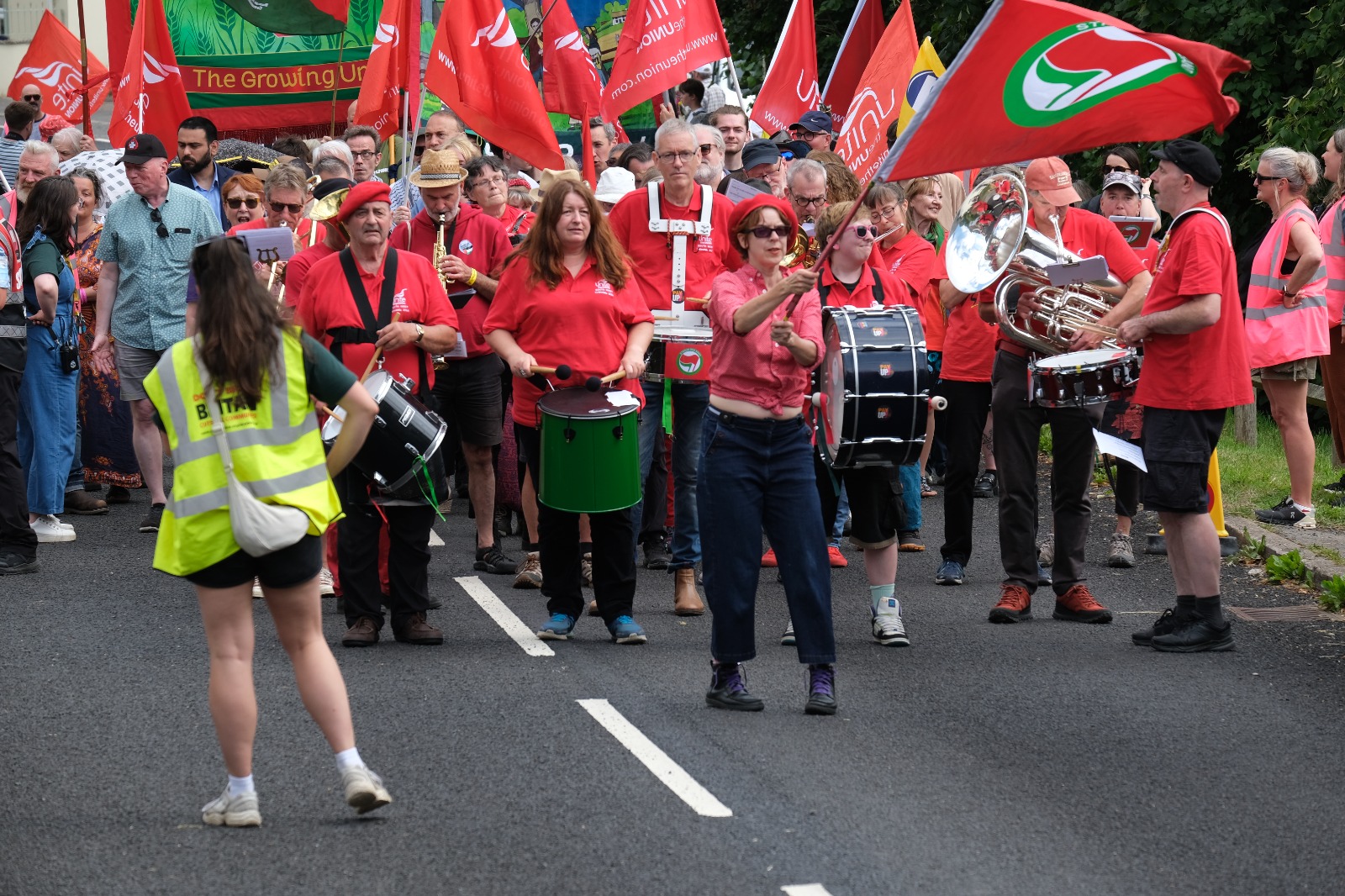 The Stroud Red Band (from Stroud!) is a community-based ensemble that plays on the streets in support of progressive causes. They play a selection of African, Latin, protest and the odd Jazz or pop tune, along with favourite Marxist marching classics including Bella Ciao, the Red Flag and the Internationale.
