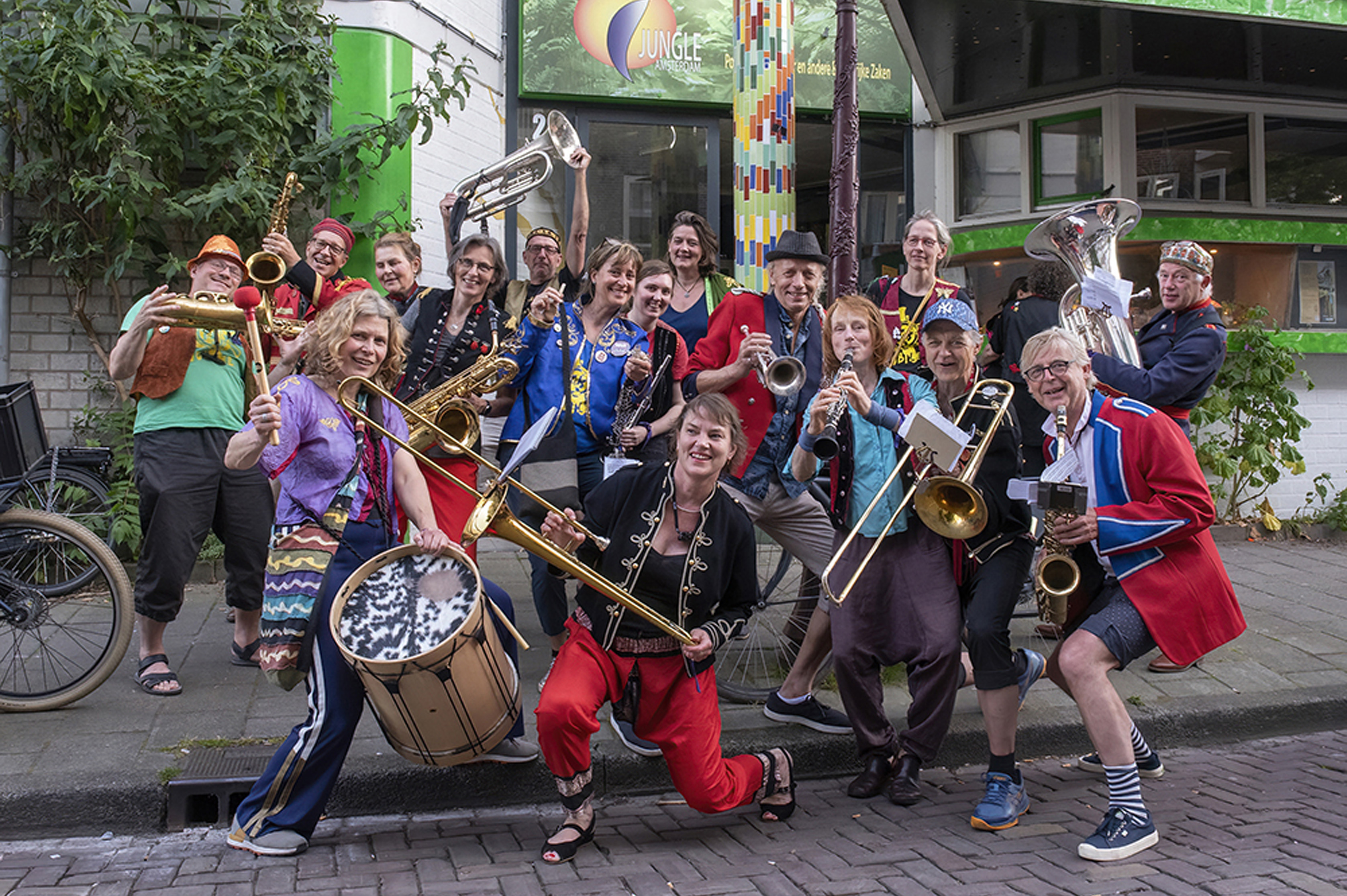 Toeters & Bellen are a street band from Amsterdam playing music from all over the world on streets, squares, in parks, neighbourhoods and at demonstrations in the Netherlands and further afield. Over the last three decades the band has enjoyed joining other orchestras and various artists on stages & festivals, parties, journeys or otherwise!